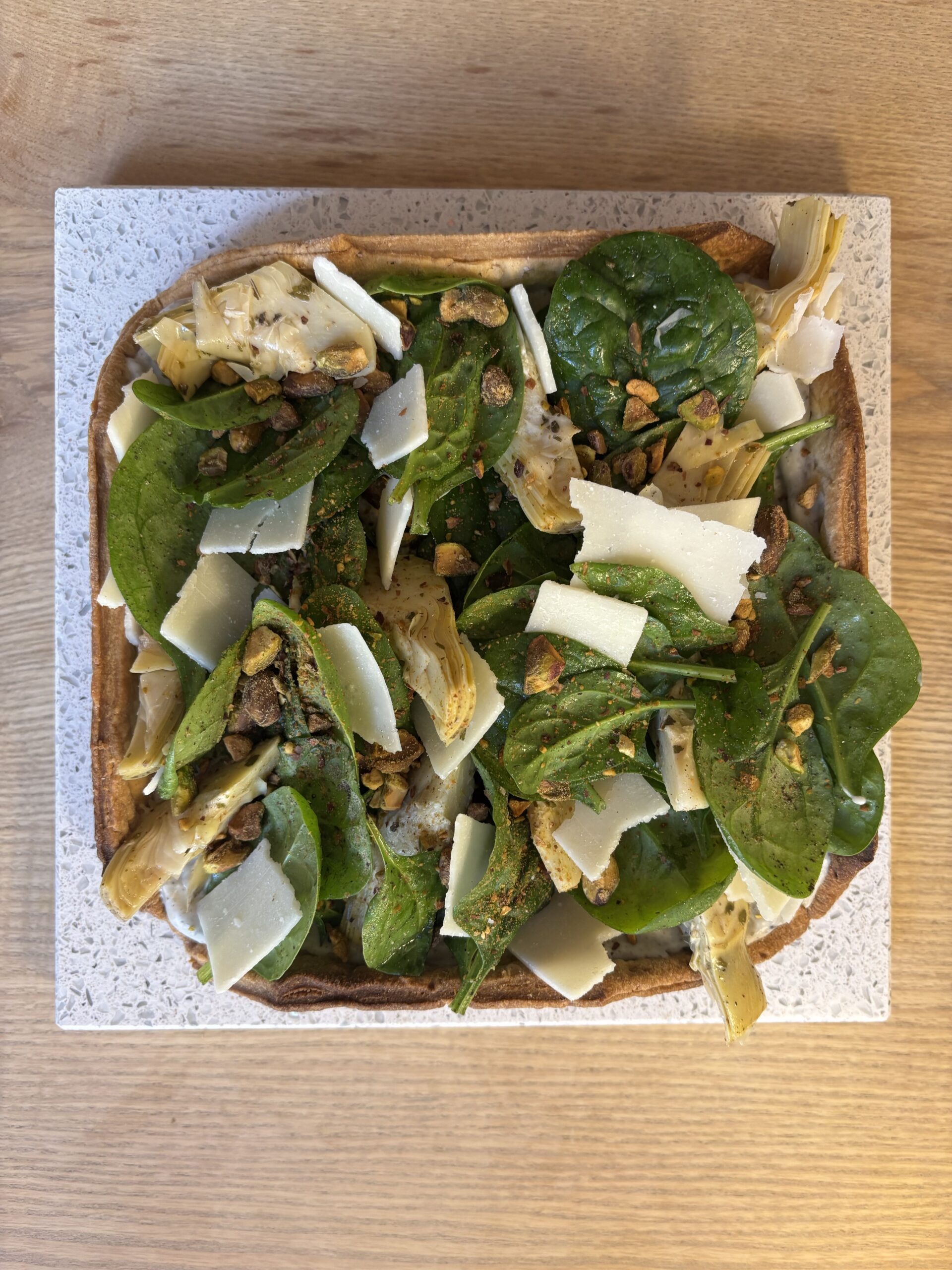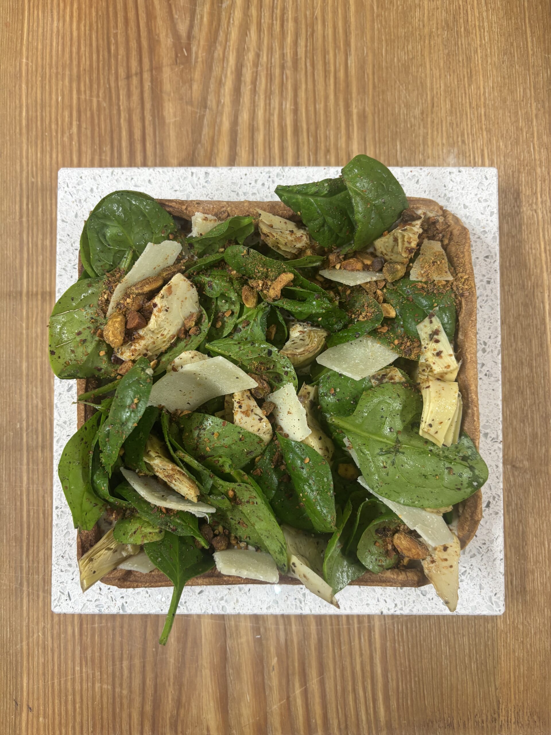 La générosité de la truffe s’épanouit dans une crème végétale à la tartufata, accompagnée d’artichauts marinés, de pousses d’épinards, de copeaux de Grana Padano et de pistaches torréfiées.