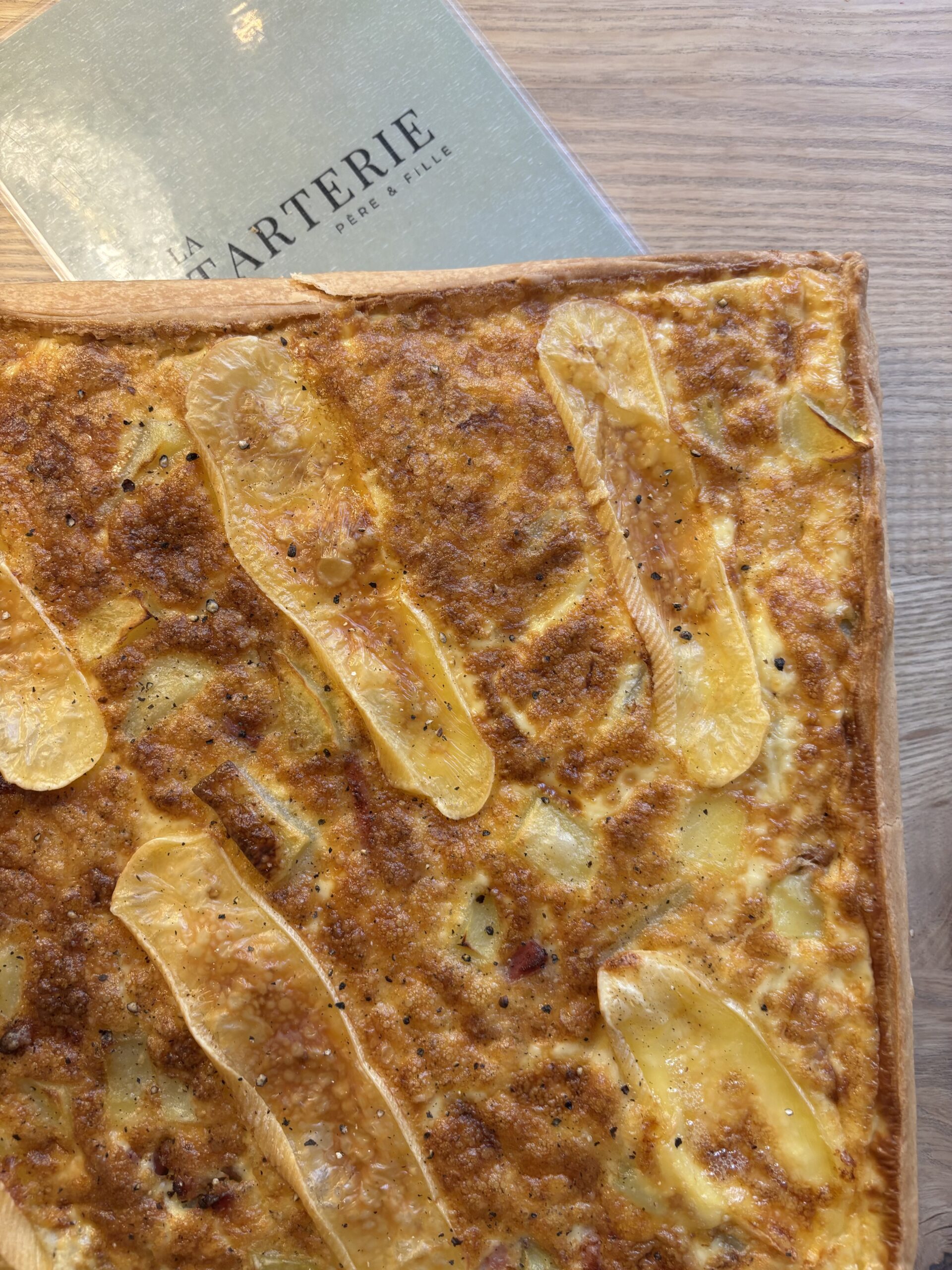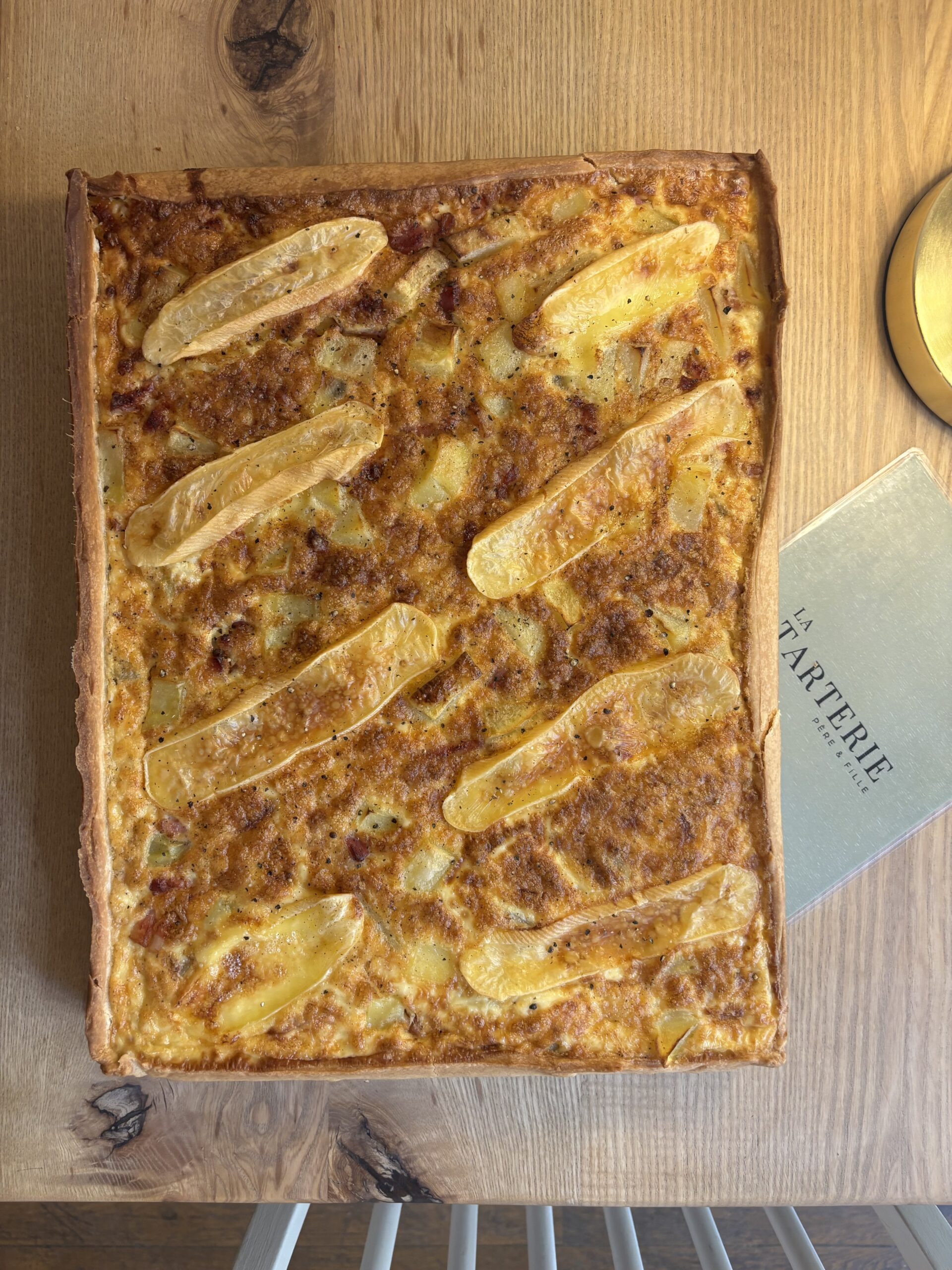 Le confort régressif d’une montagne enneigée dans une tarte généreuse : lardons fumés, pommes de terre fondantes, oignons, crème et reblochon AOP.