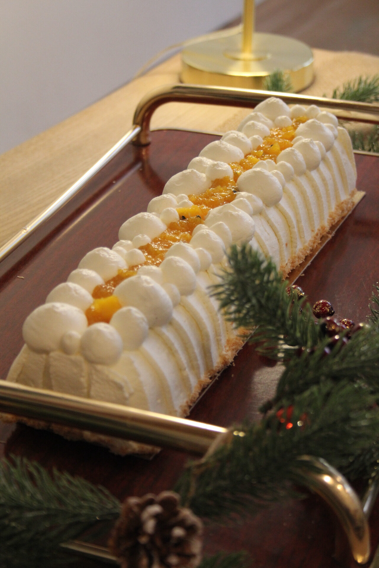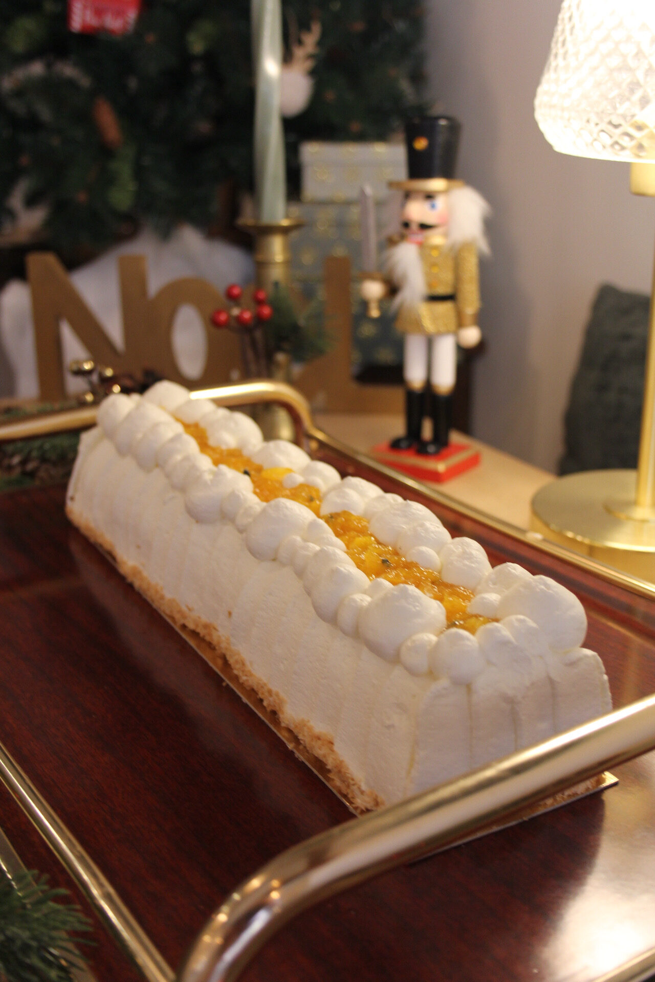 La Bûche ROCHER COCO : Légèreté et exotisme s’entrelacent avec le biscuit coco, une chantilly coco aérienne, l’insert mangue et fruit de la passion pour une bûche lumineuse, fraîche et délicatement parfumée.